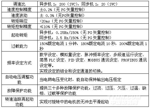 Goodrive300变频器是深圳市英威腾电气股份有限公司新开发的一款高性能开环矢量变频器,具有V/F和无PG矢量两种控制模式,其中在突加减载荷的情况下,速度波动非常轻微;可支持永磁同步电机、变频器电机、直驱电机等,可以为用户减少库存,不再需要为不同的电机备用不同变频器的库存;具有准确的电机参数自学习功能,支持旋转自学习与静态自学习,其中静态自学习可以在电机无法脱开负载的场合准确的学习电机的参数;具有先进的全程三相调制方式,使电机运行更平稳,噪音更小;其他的特性参数、功能如下表所示: