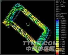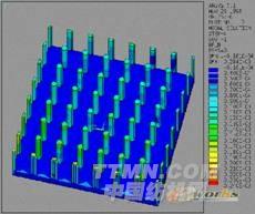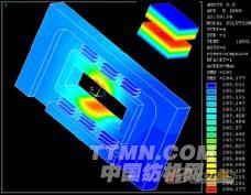 图7-1、7-2采用ANSYS CFX对某机载电子产品进行水冷分析,图示为散热冷板上的温度分布和冷却水的流线图。