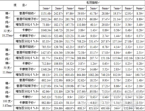 4、无论是普通环锭纺筒子纱还是卡摩纺筒子纱,毛羽值从1—9mm在大幅度的递减,这是由于在纺纱加捻过程中短纤维中较长的毛头毛尾容易向中部聚集的结果,随着棉纱特数的降低,普通环锭纺筒子纱,卡摩纺筒子纱的毛羽从1—9mm均在降低,而且4mm以上的毛羽值降低数量极为明显,这是由于随着棉纱特数的降低,单位截面积内纤维根数减少,同时短纤维的含量也在减少,毛头毛尾不易浮游产生的结果。