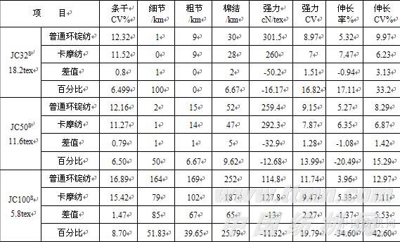2、卡摩纺筒子纱同普通环锭纺筒子纱比较,卡摩纱条干CV%值明显改善,强力明显提高,伸长率明显增大,强力CV%值,伸长CV%值明显降低,但对细节、粗节、棉结的改善只有当纱支升高到一定程度后才极为明显。