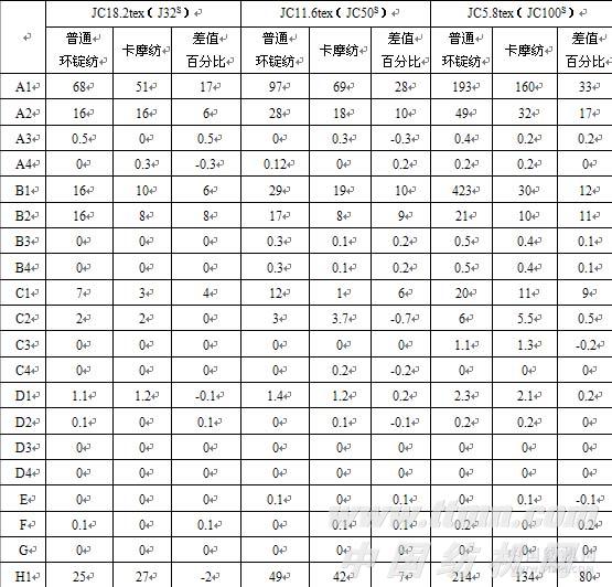 1、卡摩纺筒子纱同普通环锭纺筒子纱比较:A1,A2,B1,B2,C1类小纱疵,卡摩纺筒子纱比普通环锭纱明显减少,同时H1,H2,I1,I2类细节卡摩纺纱也较普通环锭纱明显改善,这是由于短纤维部分向纱截面运动和吸附加捻均匀分布浮游纤维、浮游纤维扩散量降低的结果。
