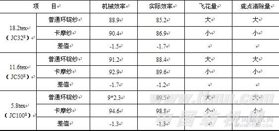 1、无论是机械效率还是实际效率,同种特数纱相比较,卡摩纱比环锭纱效率提高,这是由于卡摩纱毛羽较少,飞花较少而产生的剪切疵点少的结果。