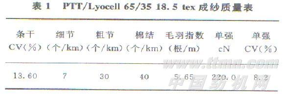 PTT纤维是一种新型的改性涤纶纤维,它具有良好的弹性恢复性和染色性能,是弹性服装的理想面料,其制成品具有很高的附加值。为了提高我公司市场竞争力,我们开发了PTT/Lyocell65/35 18.5 tex混纺纱。