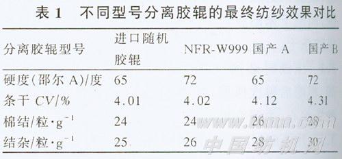 根据胶辊使用情况,首先要求制作好胶辊;其次还要使用好胶辊,更要管理好胶辊;这样才能取得好的效果。在制作过程中,我们使用性能优良的带变频调速的830磨床(仿日本三菱磨床),选择粒度为S()号、宽为32 122122的大气孔宽砂轮,以增大磨砺的接触面;在磨砺过程中利用变频调节小车头速度,以选择最佳的磨砺效果。另外。改变以往的磨砺次数,由2个往复改成3个往复,使胶辊的表面更加细腻、滑爽;达到良好的表面粗糙度。由于E7/5精梳机使用时间长,对胶辊加压不稳定,常常造成棉网状态不良;针对这一情况,我们适当放大分离胶辊的直径,经上车使用后取得良好的效果,棉网状态明显好转。经过与进口胶辊的对比使用,NFR—W999型分离胶辊与进口胶辊的各种质量指标相差无几,详见表1。