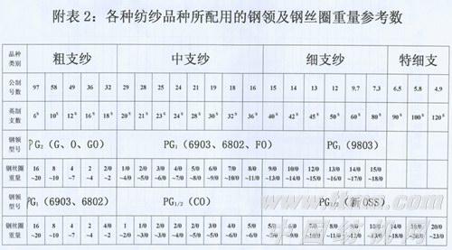 (3))PGl钢领纺细支纱时一般可配用9803、13/0~18/0,具体重量号可按原来纺细支时用PGm钢领配用OSS或Rss时的钢丝圈号数(如9/0)的实际百只克重数(如2.43克/百只)对应至9803、2.43克/百只为14/0,见各种钢丝圈百只克重表(附表一)选取。
