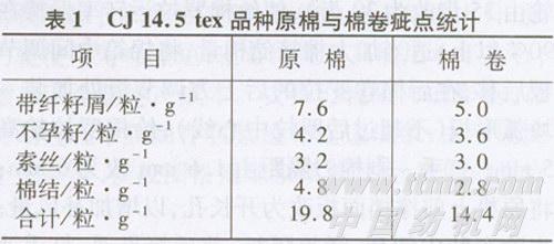 表1 CJl4.5 tex品种原棉与棉卷疵点统计
