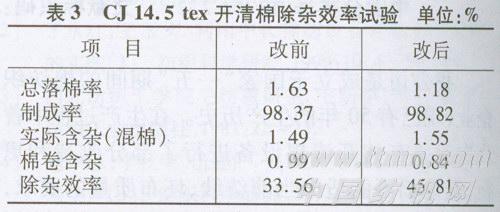 表3 CJl4.5tex开清棉除杂效率试验 单位:%