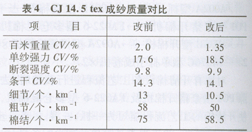 量对比如表4所示。从表4的试验分析可以看出改后比改前成纱质量显著提高。 .