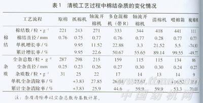 1.2.1 开清棉工艺流程越长、除杂越好,棉结增长越多 原北京第三棉纺织厂AFIS纤维检测仪对原棉经过清梳设备后的棉结、杂质变化进行测定(表1)。