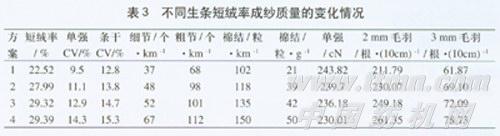 从整体看,棉结、杂质的去除在清梳工艺中有互补性,但短绒经梳棉工序后不减反增,所以从整个设备、工艺、质量要求来看,清梳联的上要矛盾足短绒,而短绒又是影响成纱质量的主要因素,河南南阳纺织集团的试验结果(表3)充分说明了这点。