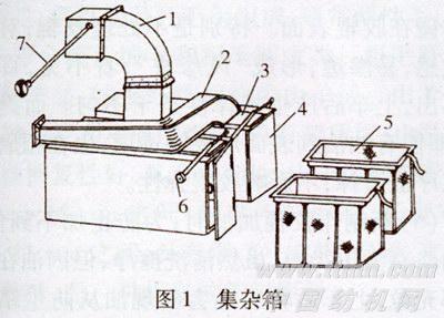 从每个纺纱器分梳腔分离出来的杂质经排杂支管排人机身总管,再由排杂风机排人两个联体的集杂箱内,两个集杂箱中各有一个集杂袋,以收集排入的杂质和短绒,隔一定时间可打开箱门掏出袋中杂质、短绒,而排杂风则由集杂箱下口排出。这种排杂方式我们称为单独排杂,见图1。