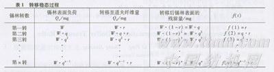 假设道夫的转移率r为常数,取q=1-r,q为锡林残留率,锡林一转从刺辊得到的纤维量为W,且今后不再有纤维喂人,喂人量等于输出量,此过程的描述可见表1。