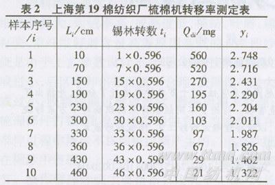 上海第19棉纺织厂对9.7 tex长绒棉精梳纱梳棉机转移率的测定情况见表2。