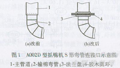 我公司共有12台A002D型抓棉机,其S形弯管连接口全部改造完毕,经过一年多的运转使用,至今没有再发生过一起因S形弯管连接口损坏造成漏风及坏车停台现象,提高了生产效率。