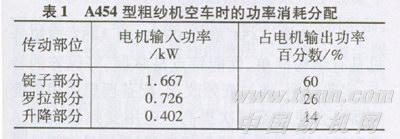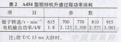 粗纱机的机械结构特征不同于开清棉机、梳棉机、并条机和细纱机,它是以拖动锭翼的粗纱锭子为主要负荷的纺织机械。经过实际测试,粗纱锭子的负载约占其电机输出功率的60%左右,其负载主要来源于锭翼的风阻转矩,尽管锭翼翅膀的断面已设计成风阻很小的流线形,但依然表现出风阻负荷的特征。表1为A454型粗纱机锭子转速为915r/min时空车的功率消耗分配,表2为A454型粗纱机升速过程功率消耗情况。