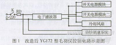 我公司在使用YGl72型毛羽仪过程中经常发生以下故障:(1)做完纱线试验后,无法启动打印机输出试验数据,需关掉电源重新启动,但试验数据全部丢失。(2)即使在不出现死机的情况下,所给出的试验数据经常会出现较大的偏差,需将异常数据剔除或重新试验。我们对YGl72型毛羽仪的控制电路进行了分析:在电源人口处安装的电子稳压器虽然降低了电源侧差模与共模分量进入开关电源输入口的水平,但由于导纱电气调速电路自身也产生高频干扰,且没有阻尼,而其所接电子滤波器一方面限制了电网对仪器自身产生的次谐波的吸收,另一方面又加剧了进入开关电源人口的分量值,并且将这种高频分量传导到开关电源的输出侧,干扰了电脑芯片0,1电平,导致检测误差及电脑系统故障。为此我们对YGl72型毛羽仪的电路进行了改造(见图1),使导纱调速系统和干扰由电网吸收,降低了对数字电路的高频干扰。