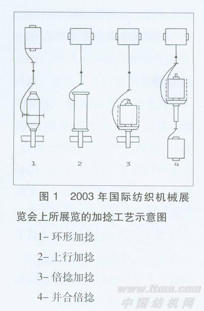 在加捻设备中,倍捻机占有主导地位。长丝经常在倍捻设备上加工,且常带有联合供料卷装,在大多数情况下没有气圈环。用在所谓的萨克森地毯的地毯纱,可通过并捻加工而加捻(见图1)