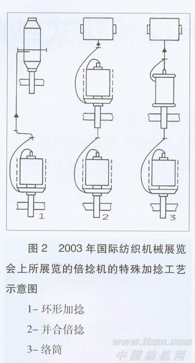 在国际纺织机械展览会上展出的占主导地位的倍捻机,有许多标准型设备。Elitex便是倍捻设备的供货商之一。Savio展示了它的"Geminis"设备。Leewha工业公司除了展示并捻络筒机的范围外,还展示了一些短纤维纺纱设备。在国际纺织机械展览会上还可以看到由廉价供货商提供的许多便宜的标准倍捻机的仿制品。Muralec公布了它投放市场的单电机驱动智能型倍捻机,Mnratec还介绍了其"Perla-D"络筒加工设备,在络筒过程中利用一个三轴圆盘摩擦装嚣减少毛羽。