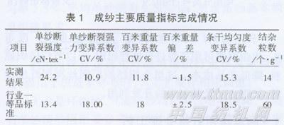 细羊毛与涤纶混纺棉纺纱线是一种新型产品,目前尚无国家标准和行业标准,合同要求参照FZ/T12005-1998普梳涤与棉混纺本色纱线标准执行。成纱主要质量指标完成情况见表1。