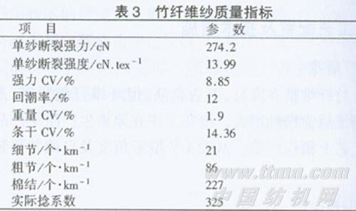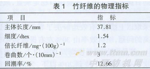 竹纤维素纤维是以天然竹材为原料,经化纤厂特殊加工制成纤维。竹纤维色泽、手感及其他性能与普通粘胶纤维类似。据报道:竹纤维有优良的染色性、弹性恢复性、悬垂性、抗菌性,特别具有优良的透气性和放湿性,其织物适宜制做高档夏季服装。我厂测定的原料物理指标如表1