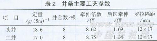 采用合适的隔距、牵伸倍数及前后区牵伸分配。皮辊采用抗绕胶管(邵氏硬度为75度)。主要工艺参数见表2