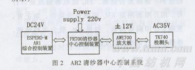 ESPERO-M型自动络筒机配瑞士LOEPFE.FR-700电子清纱器。它由TK740检测头,清纱器放大板(AWE)(位于清纱器部件内),连接电缆和清纱器中心控制装置(由一块清纱器电源板、清纱器参数设定板和插入式连接控制板组成)组成。清纱器中心控制装置由ARl综合控制系统控制(如图2)