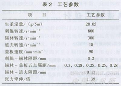 竹纤维卷曲少,梳棉采取适当定量、慢速度、紧隔距工艺配置,降低刺辊和锡林转速,合理配置张力牵伸,使棉网顺利转移。对棉条通道用汽油进行擦拭,保证通道的光洁,使生条转移顺畅,主要工艺参数如表2所示。