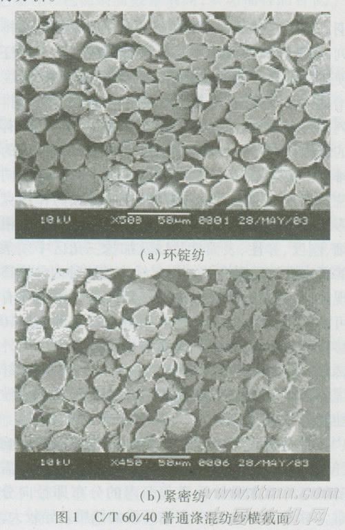 自紧密纺纱问世以来,该技术引起了广大学者和企业的关注。紧密纺纱与环锭纺纱的最大区别就在于,紧密纺纱在牵伸与加捻之间加装气动集聚区,使得成纱毛羽显著减少,强力和条干改善,纱体光洁且结构紧密。紧密纺纱技术已成功地应用到棉和棉型化纤的纯纺或混纺以及毛纺的纯纺或混纺中。但对于混纺纱线,在获得以上特点的同时,纱体中纤维的转移和径向分布还很少研究。笔者通过试验探讨了涤棉混纺紧密纱中纤维的转移和径向分布,并与传统的环锭纺纱进行了比较。