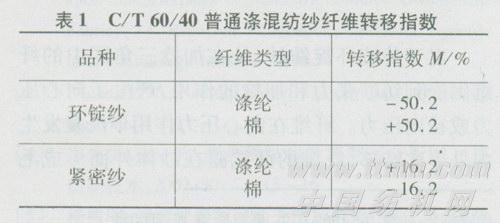 由表1试验结果可以看出,对于传统环锭纱和紧密纱,涤纶纤维的转移差异很大。环锭纱中涤纶纤维向纱芯转移的趋势很明显,而紧密纱中涤纶纤维却没有这种趋势,反而有向外层转移的趋势。