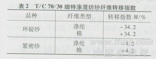 由表2试验结果可以得出,在环锭纺细特涤棉纱和紧密纺细特涤棉纱中,细特涤纶纤维都有向纱芯转移的趋势,但从数值上看环锭纺纱中涤纶纤维转移指数的绝对值要大于紧密纺中涤纶纤维转移指数的绝对值。这说明在传统的环锭纺纱中,细特涤纶纤维向纱芯转移的趋势要比紧密纺明显得多。