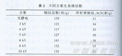 2.2 由表2可知,采用静电特殊吸风装置后对棉结排除也是有一定的效果的,其采用3 kV、4 kV时,棉结总数分别比不加静电板的特殊吸风装置减少10%、13.3%,这证明,该装置对棉结排除的效果比较明显,但对于带籽屑棉结SCN来说,则无任何效果,以下几个因素都有可能造成带籽屑棉结去除困难:1)带籽屑棉结较重,静电场的静电力要将其拉出需要克服阻力较大;2)带籽屑棉结较重,静电力只能将其吸附到空气负面层中靠近锡林针齿较近位置,而本试验中除尘刀隔距较大,故不能将它们挡下而去除;3)导板长度较长,可能被吸附出的带籽屑棉结由于其重量较重,在导板区内可能再落回到棉纤维流中。
