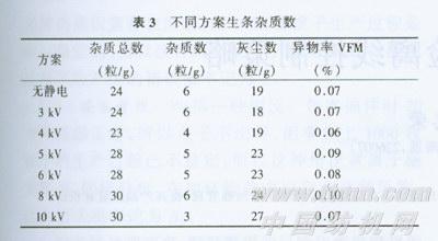 由表3数据可看出,静电特殊吸风装置对杂质的排除也是有影响的,其中在4 kV时杂质数有一定的改善,杂质粒数下降33%,异物率下降14.3%,其它方案对杂质和灰尘影响不大,甚至有所下降。