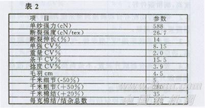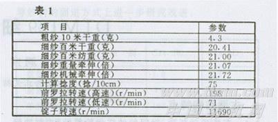 2.3.2 根据捻度分布原理,纱因粗细不同而获得的捻度不同,故竹节纱竹节部分因较粗而获得的捻度少,这就造成竹节处纤维较松散。生产中易在竹节尾端产生棉球。解决这一问题:一要注意保持纱线通道的畅通;二要合理选配好钢丝圈型号,防止因竹节处通过钢丝圈后造成钢丝圈瞬间受力分布不匀产生跳动,从而挂伤纱线产生棉球。我公司在生产T/R 80/20 21rex时使用的是7201型63.5号钢丝圈。因该圈重心较高,纱线有较大的通道空间,可解决棉球纱的产生。