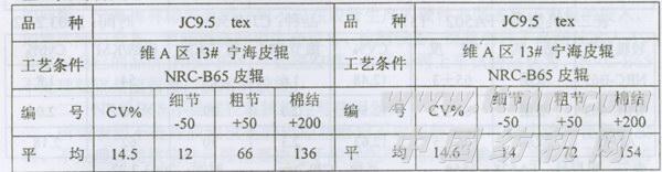 现将NRC-B65,J-463不处理胶辊分别在同锭、同纱号、同粗纱上作对比试验,其乌特斯条干、CV%值、粗节、棉结对比表如下: