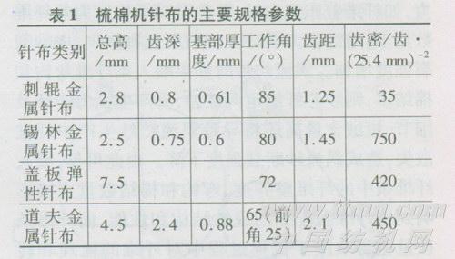道夫针布:道夫针布的主要作用是凝聚纤维,把已分梳好的单纤维及时从锡林上充分转移出来,凝聚成棉网,道夫针布应具有足够的抓取握持能力。因此,为了保证纤维及时、充分、正常转移和解决高速气流的顺利引导问题,可利用齿高、大齿隙容量、小工作角、弧形齿尖来提高转移能力。道夫针布齿深加大,齿间容量加大,道夫针布的握持抓取力大,有利于容纳更多的纤维,有利于锡林和道夫作用区气流的引导和下泄。采用弧形变角齿尖可极大地提高道夫针布的剥取转移性能,减小齿尖角有利于对纤维层的穿刺和棉网凝聚,而且还使棉结显著降低,改善了棉网质量。