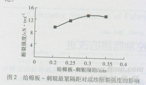 图2为给棉板与刺辊最紧隔距对竹纤维涡流纱断裂强度的影响。刺辊速度较高,刺辊对给棉罗拉与给棉板握持的纤维进行激烈的开松分梳,处理不当容易造成纤维损伤。为了避免过多损伤纤维,提高成纱强度,可采用弧形给棉板,给棉板与刺辊最紧隔距应适当放大些。同时,应加强落棉控制,适当提高除尘刀位置和增大除尘刀的安装角度,并在不干扰刺辊气罩部分气流情况下加大吸风量,特别是加强后车肚吸风,消除除尘刀和小漏底挂花,减少纤维的损失。还可以采用无网眼光板漏底,入口隔距缩小,这样可以阻止大量气流进入漏底造成的气压过高,减少小漏底内部积花。