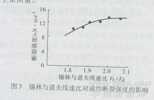 图3为锡林与道夫线速比(Vc/Vd)对竹纤维涡流纱断裂强度的影响。选用的竹纤维细而长,刚性小,抗弯强度低,吸附性较好,梳理过程中易产生静电,会影响纤维转移。研究发现,随着锡林与道夫线速比的降低,生条中纤维弯钩数量显著增加,成纱条干和单强明显下降。锡林盖板工作区梳理好的纤维如果不能被道夫良好地转移出去,就会重回到锡林和盖板之间形成重复梳理,过度重复梳理将使短绒增加,也会搓出新的棉结,且影响纤维伸直度。根据竹纤维的性能特点,在适当降低道夫速度的同时,减小锡林与道夫隔距,适当增加锡林与道夫间线速比,增强纤维从锡林向道夫的转移能力,通过实现快转移,提高纤维从锡林向道夫转移时的纤维伸直度,减少纤维弯钩的产生,加强分梳度,提高对结杂、短绒的排除,改善生条质量。