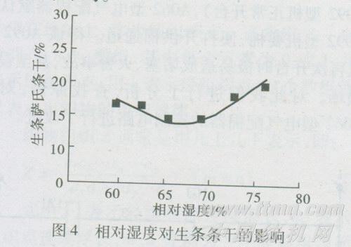 图4是相对湿度对竹纤维生条条干的影响情况。由于竹纤维回潮率较高,但竹纤维细而长,梳理过程中存在静电现象,纤维易粘附针布,纤网剥取困难,相对湿度对竹纤维成纱质量的影响十分明显,不能忽视。相对湿度过高,退卷粘层影响喂人纤维均匀度,增加分梳负担,纤网转移差,导致棉结、杂质增加,纤网剥取困难,易产生下垂、破洞甚至断头;相对湿度过低,静电作用增强,纤维粘附针布,影响道夫转移,易使纤网上飘、破裂,生条蓬松,条干不匀。