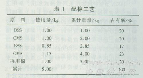 我公司常年生产的混色纱产品是MM1030(第一个M代表染色纱,第二个M代表精梳纱产品)。进行混色纱生产时,首先要对原料进行含水率、颜色等的试验,尽量使用差异小的同一批原料,如差别大的同一颜色原料要3包一起使用。如果同一包内各部分含水率不同,要烘干后使用(湿原料使用对纺纱工程增加难度,并容易发生粗细节等)。配棉秤以1/10g为单位,配棉之前对电子秤进行检查。配棉时要以染色棉一白颜色原棉一染色棉一白颜色原棉为基本顺序。清花给棉时在帘子上人为均匀混和。在配制混和原料时,还可以使用少量再用棉(包括棉条、粗纱被打碎后形成的碎棉、以及细纱吸风棉)。但再用棉使用应不超过染色棉总量的20%。配棉中加染色棉比例超过50%时,再用棉使用相应地减少。如:40%基准再用棉使用10%。当然,在未配棉之前,要进行色棉纱的试验,通过一定比例染色棉的投入,制造出色棉纱,随后利用小型织布和针织机织出客户所要求的样品。原料投入时以筐为单位,每5kg为一筐。配棉时不能把染色棉和白色原棉分别集中在一起,两次就配好了一筐棉。由于染色棉纱对质量的要求很高,在配棉时不能把普梳棉条当成精梳棉条使用。MM10配棉工艺如表1。