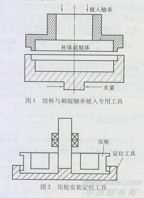 (1)纺杯、刺辊轴承容易损坏是因为其植入方式不当,为此,我们设计了专用工具加以固定(见图1),防止轴承在冲压时进出位置不一致或发生倾斜,提高轴承的安装精度和使用寿命。