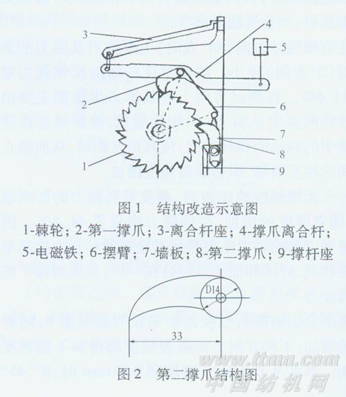 由于在纺纱过程中升降杠杆上下动程快,蜗轮和蜗杆没稳定就又开始随着棘轮作往复运动,落纱次数越多,蜗轮和蜗杆磨损就越严重,导致撑齿倒牙现象的产生。我们针对这一情况利用撑杆座部位上的螺丝孔做出第二撑爪(见图1、2)。这样原来的撑爪动一下,第二撑爪就跟上而不再产生倒牙现象。同时这个撑爪具有通用性,对多大棘轮都能使用。