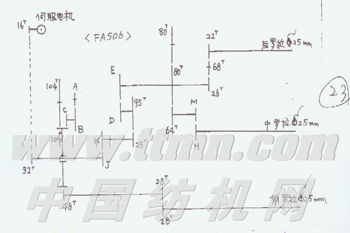 (4)该装置在原细纱机牵伸部份蝴蝶牙104T处将前后罗拉传动路线断开,并装入由伺服电机控制的传动系统,如下图所示。