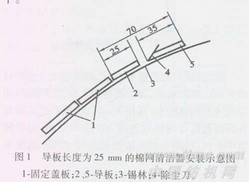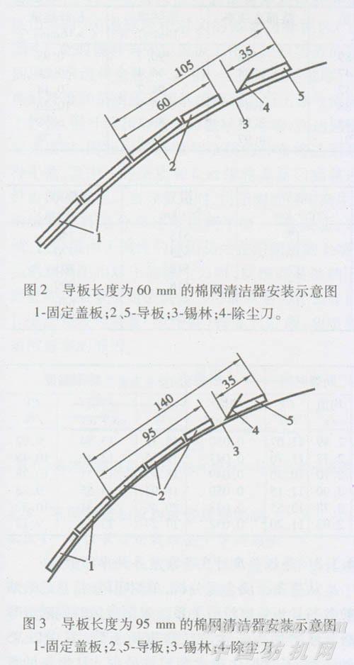 在高产梳棉机上加装各种附加吸风装置已经成为当代高产梳棉机上发展的潮流,在各种附加吸风装置中,杂质和短绒以两种方式与纤维流分离,一种是采用反向齿,如Rieter公司C60型机和C51型机的Trexplus和温州锦峰公司生产的棉网清洁器;另外一种采用导板,如Crosrol公司的MK5D型机、Marzoli公司的CX400型机、C501型机、C601型机,Trutzschler公司的DK903型机、TC03型机等。CX400型机导板长度为33 mm.C501型机导板长度为35 mm,MK5D型机导板长度为72 mm,DK903型机除尘刀与罩板边缘距离为58 mm(实测),DK760型机后罩板导板长度也超过160 mm。从以上数据来看,各种机型棉网清洁器导板长度是不一样的。为了探讨不同的导板长度对成纱质量的影响,笔者设计了装有不同导板长度的棉网清洁器,即在后罩板加装了两根固定盖板,在固定盖板前分别加装25 mm导板、60mm导板、95 mm导板(三个方案导板与除尘刀距离均为10 mm)。它们具体安装示意图分别见图1、图2、图3,分别采用单侧和双侧吸风在其他工艺完全相同条件下进行对比试验,试图寻找出最佳棉网清洁器导板长度。现就其试验结果分述如下.