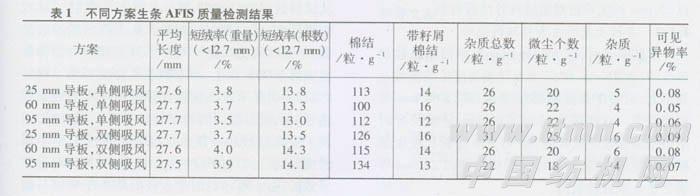 从单侧吸风来看,随导板长度增加,生条短绒含量略有降低,与25 mm导板长度的方案相比,60 mm导板方案根数短绒降低2.6%,95 mm导板方案降低5.3%。从双侧吸风各个方案来看,随导板长度增加,生条短绒含量有所增加,而且生条中纤维的平均长度略有降低,说明导板加长在风量加大情况下不利于短绒排除,在双侧吸风时,以25 mm长度导板对短绒排除比较有利。