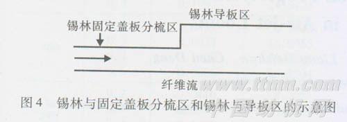 从单侧吸风来看,导板长度增加,棉网清洁器吸出落物总重、落物中长纤维含量、落杂的绝对重量、短绒总重都在减少,说明导板并非越长越好,从试验数据看以加装25 mm导板为最佳。从双侧吸风看,也有类似的规律。从去除短绒的效果看,单侧吸风比双侧吸风要好,单侧吸风时落棉含短绒都在90%以上,而双侧吸风都在73%~84%之间,证明并不是风量越大排除短纤维的效果就越好。从吸尘器废物的试验结果看,导板加长不利于清除短绒和杂质。对废物量排出也是不利的,即导板长不利于废物量的排出,其原因可做如下分析:由于锡林与固定盖板隔距小于导板与锡林隔距,这样一来纤维流从固定盖板与锡林分梳区出来时,突遇隔距相对大的锡林与导板区(见图4),此时锡林与固定盖板工作区出口附近的附面层纤维流将会膨胀、扩散,气流附面层增厚,一些好纤维和杂质还有短纤维都将会随上浮气流向上扩散,但纤维和杂质等将做减速运动,在达到稳定速度时,附面层中纤维和杂质的分布将达到某种平衡,其中一些杂质和长纤维将重新回到靠近针齿的位置上。当导板短时,由于附面层中杂质、短绒和长纤维分布还没达到平衡,一些杂质、短绒、长纤维由于惯性的原因仍处在附面层的上端,当遇到隔距相对小的除尘刀时,就很容易被挡下而被吸风装置吸走去除。这可能就是为什么导板长度越短吸风装置(吸尘器)排除长纤维、杂质和短绒越多的原因。
