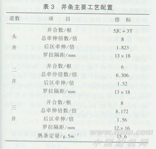 JC/T60/40 11.7tex采用三道混并工艺以保证纤维混和的均匀性。由于细旦涤纶纤维根数多,纤维间摩擦力大,在牵伸中牵伸力较大,为避免并条牵伸不开,对并条工艺参数采用“较大罗拉隔距、增大后区牵伸、减小总牵伸倍数”的原则,以提高条干水平改善纤维平行伸直度。经过工艺调整,熟条条干cv值可达2.4%。并条主要工艺配置见表3。