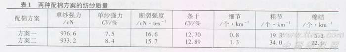 我们对T/C 65/35 58.3 tex转杯纱的配棉作过两个试纺方案,方案一为四级原棉、五级原棉、精梳落棉占60%,破籽、滤尘花等占40%;方案二为四级原棉占13%,五级原棉占12%,破籽、滤尘花等占75%。在其他条件均不改变的情况下,两种配棉方案纺纱质量见表1。