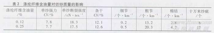 为了解涤纶纤维含油量对成纱质量的影响,在其他条件不变的情况下,我们对0.12%和0.25%两种含油量的涤纶进行了纺纱试验,结果见表2。