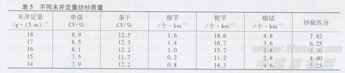 我们曾经采用与环锭纺基本一致的末并重定量,但成纱质量很不理想,定量试验结果见表3。末并采用重定量时,转杯纺喂人钳口单位截面内的纤维根数多,使分梳辊受到的阻力较大,分梳辊负担较重,纤维梳理不充分,容易缠绕在分梳辊上,使得转移不够顺畅。同时,纺纱器给棉板钳口对重定量条子的握持作用减弱,也容易导致成纱条干恶化,甚至产生竹节纱。但是如果条子定量过轻,产生意外牵伸的可能性会大大增加,也不利于条干的控制。因此,定量以15g/5 m左右为宜。