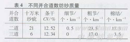 传统工艺流程中,转杯纺并条道数以两道为主。但对于涤棉品种而言,如采取两道并合,棉与涤纶纤维的均匀混和问题较难得到有效解决,虽然在转杯纺中能起到一定程度的混和作用,但效果有限,布面上容易出现色差。为解决此问题,我们进行了二道并合与三道并合工艺流程的跟踪试验,结果见表4。从表4可以看出,三道并合比二道并合具有明显的优势,尤其是棉涤混和均匀后,解决了布面色差的问题。